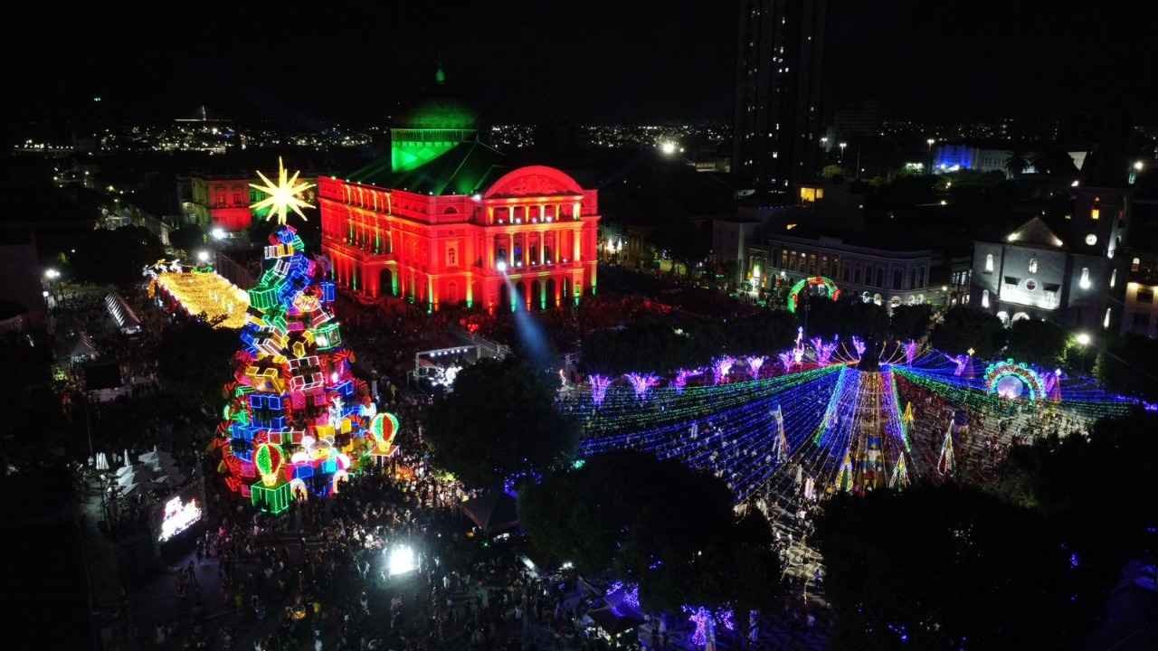magia do Natal já tomou conta de Manaus. No Largo São Sebastião, ao redor do icônico Teatro Amazonas, a decoração deste ano inclui uma imponente árvore de Natal de 23 metros e bonecos gigantes que simbolizam a festividade. O local será o cenário principal para o espetáculo “O Mundo Encantado do Natal”, que marca a abertura das comemorações neste domingo, a partir das 17h.